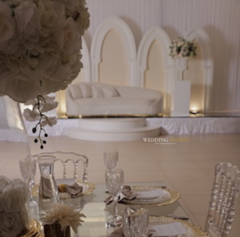 Een elegante en serene weddingstage met een minimalistische uitstraling. De zachte kleuren en klassieke boogvormen zorgen voor een rustige en tijdloze sfeer die perfect past bij een stijlvolle bruiloft.